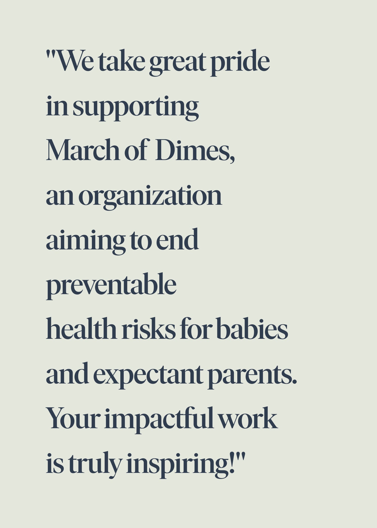 - تُعدّ مؤسسة "مارش أوف دايمز" منظمة أمريكية كبيرة تهدف إلى القضاء على المخاطر الصحية التي يمكن الوقاية منها للأطفال الرضع والأمهات الحوامل. ونحن ندعم مراكزها الصحية المتنقلة للأمهات والأطفال من خلال التبرعات المالية.